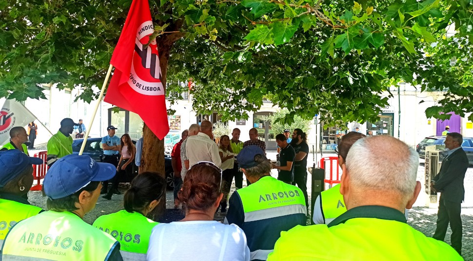TRABALHADORES DA UNIÃO DAS FREGUESIAS DE PÓVOA DE SANTA IRIA E FORTE DA CASA EM FRENTE À SEDE DA JUNTA DE FREGUESIA LUTAM PELO PAGAMENTO IMEDIATO DO SALÁRIO E SUBSÍDIO DE NATAL EM FALTA