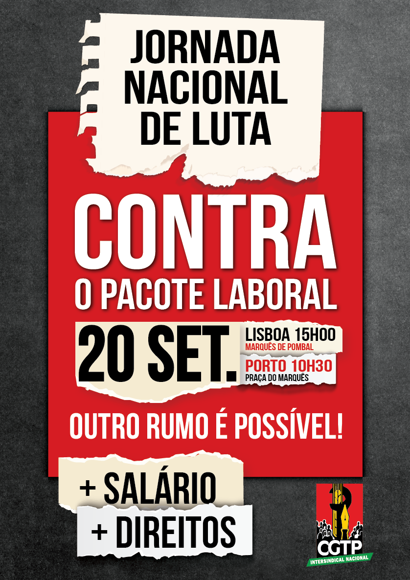 É já no dia 20 de setembro, sábado, em Lisboa, a manifestação contra o Pacote Laboral do governo do PSD/CDS-PP, com concentração às 15h00, no Marquês de Pombal. A dinamização da jornada de luta está em marcha, afixam-se faixas e pendões na rua, realizam-se distribuições à população, como aconteceu em Vila Franca de Xira com os sindicatos SITE-CSRA e SIESI, junto à estação do comboio. Promovem-se plenários com os trabalhadores para discutir os impactos destas propostas de revisão da legislação laboral têm na vida dos trabalhadores.